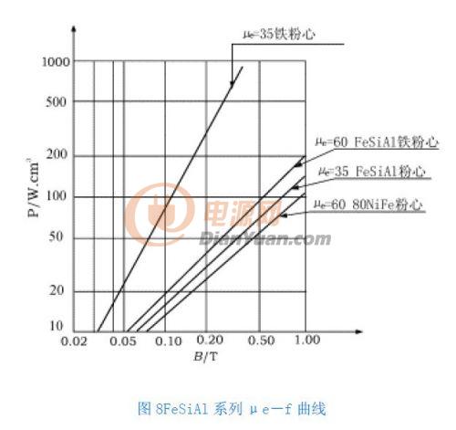 国外文献对于PFC电感材料一般都介绍坡莫合金系列,笔者以为,2Mo80NiFe磁粉系列(μe=160,147,125,60等)有优良的性能,其频率特性、电流特性,损耗特性均为目前最高水平,而且系列化,有可选择余地,但是价格比较昂贵,在电源价格竞争激烈的今天,很多使用者无法接受,我们向广大电源工作者推荐比较廉价的FeSiAl粉心。