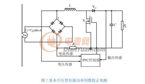 开关电源的功率因数校正器(PFC)可分为两类,一类为有源PFC,由电感电容及电子元器件组成;另一类为无源PFC,一般采用电感补偿方法使交流输入的基波电流与电压之间相位差减小来提高功率因数。在校正电路中有源PFC较多采用高频升压电路功率因数开关调节器,通常采用Boost电路,基本电路拓朴见图1。