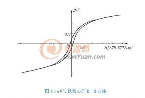 图4是有效磁导率为75的铁粉心的静态磁滞回线,和铁氧体材料相比,有高的Bs值,不易饱和,因此体积至少可减小一半,采用廉价的铁粉作原料,并且不需要开口,没有噪声,成本可大大降低,价格可以和铁氧体比拟,以 27× 14×11的规格为例,它可以承受400安匝而不饱和,优点突出。
