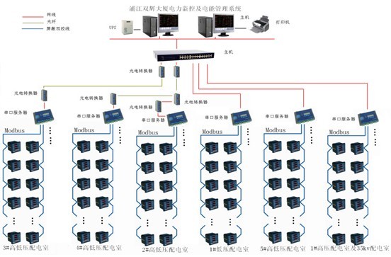 浦江双辉大厦监控部分有1个35kv配电室, 1#、2#、3#、4#、5#5个配电室分10kv高压和0.4kv低压。35kv配电室有高压电力仪表、综保和2台变压器温控仪,另外5个配电室有10kv高压电力仪表和综保,0.4kv低压部分有电力仪表和22台变压器温控仪。35kv和1#配电室分布在A栋的B2层,2#配电室分布在B栋的B2层,3#配电室分布在A栋的33楼,4#配电室分布在B栋的33楼,5#配电室分布在A栋的B4层。针对浦江双辉大厦的实际情况,通过计算机和通讯网络,将分散的配电所的现场设备连接为一个有机的整体,实现电网设备运行的远程监控和集中管理。