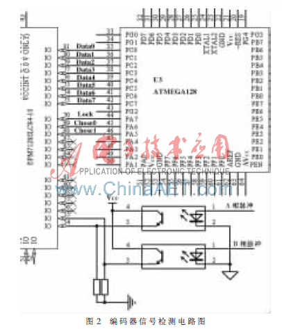 如图2所示,光耦将旋转编码器A、B两相脉冲信号与CPLD的信号隔离,防止EPM7128和旋转编码器的工作电压不匹配。EPM7128对A、B两相脉冲信号进行四倍频和双向可逆计数的硬件描述程序可参考文献[2]。图中Lock是单片机发送给EPM7128的计数值锁存信号,Chose0和Chose1是位选信号,控制EPM7128将锁存的计数值的高8位和低8位分时发送到数据线Data0~Data7上。若编码器输出脉冲数为N,则系统的精度可以达到π/2N弧度。