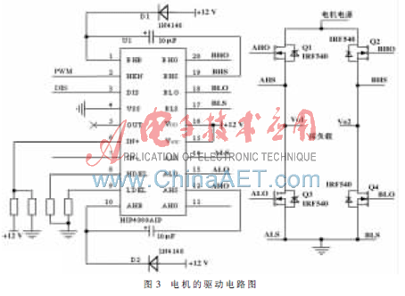 用单片机的PWM输出对电机控制是实现电机数字控制的常用手段。目前常用的电机控制专用芯片是NS公司的LMD18200,其工作电压55 V,连续输出电流3 A,可接收300 kHz的PWM脉冲,但是本系统选用的直流力矩电机经常工作在堵转状态,LMD18200不能提供持续的5 A电流,若将LMD18200并联来增大电流驱动能力,又有烧坏芯片的风险,所以本文选择由一片HIP4080、4片MOS管IRF540构成的电机驱动电路,如图3所示。