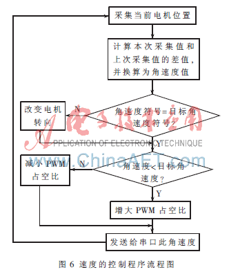 如图6所示,电机速度控制中,ATmega128接收PC机发来的电机目标速度,根据速度方向驱动电机转向,其定时器计算出实际速度后和目标速度比较,相应地增大或减小PWM占空比,改变速度大小,直到电机运行在期望的速度上。