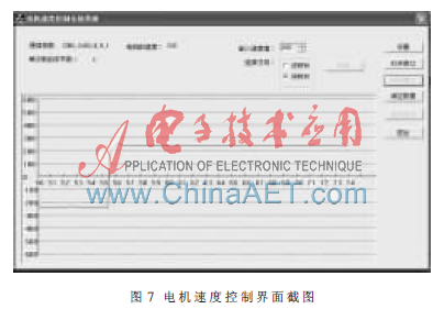 以上属性设置完毕后打开串口,在事件驱动函数中接收数据,依次将其转换为绘图设备区域中Y轴上的像素值,同时顺序连接各点绘制曲线并更新,实时表示电机转动角度和速度的变化。如图7所示,是电机速度控制界面的截图,横轴表示时间,纵轴表示转速,曲线的跳跃是电机速度方向的改变。