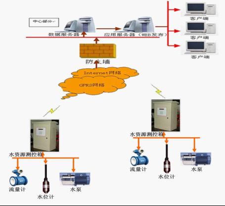 水资源远程监控系统,是一种软件与硬件结合的自动化网络式管理系统。它是在水源或用水单位设备上安装一个水资源测控器,实现对水表流量、水井水位、管网压力及对用户水泵的电流、电压的采集,以及对水泵的启停、电动阀的开闭等控制,通过有线或无线通讯方式与水利局水资源管理中心计算机联网,实时对各用水单位进行监管和控制。相关的水表流量、水井水位、管网压力及用户水泵的电流、电压的数据采集等自动存入水资源管理中心计算机数据库。如用水单位人员为断电、外加水泵,水表自然或人为损坏等情况出现,管理中心计算机会同时显示故障原因并报警,便于及时派人到达现场。 特殊情况下,水资源管理中心可根据需要:在不同季节限量采水,控制水泵启停泵;对欠缴水资源费的用户,水资源管理中心工作人员可通过计算机系统对用水单位的电动阀开闭、水泵的启停进行异地远程控制,实现水资源管理与监控的自动化和一体化。
