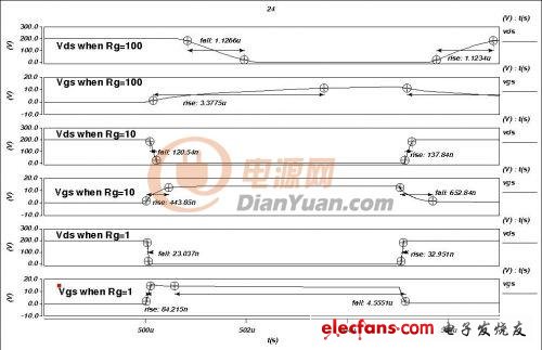 仿真过程是,Rg分别取1欧姆,到10欧姆,到100欧姆。验证Rg取值对驱动波形Vgs和开关导通特性Vds影响。结果如下图: