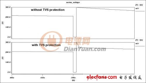 采用TVS管保护电路前后,Vd1仿真波形对比图: