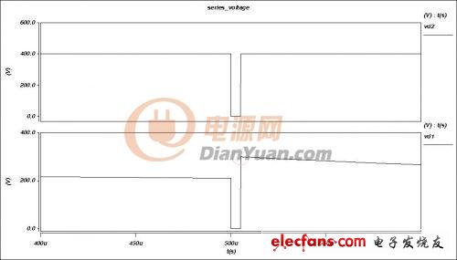 Q2的驱动电路中Rg=15,Q1的驱动电路中Rg=10,这样的目的是在讨论驱动电路中等效电阻的不一致(可能来自Rg本身不一致,也可能是线路不同,器件不同而造成的不一致)情况下,对串联MOSFET导通过程影响。观察Vd1和Vd2两点的波形,如图: