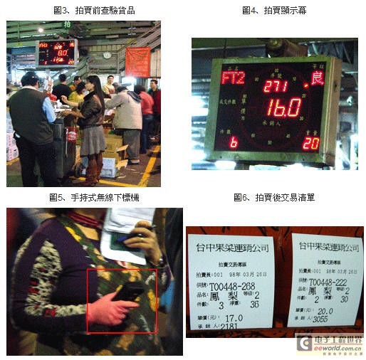 由果菜运销拍卖人员进行拍卖,下标人员可在拍卖区进行货品品质查验。下标人员经由手上无线下标机进行下标,拍卖机系统列印拍卖清单。