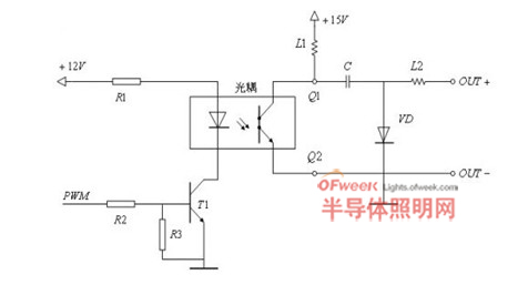 限于篇幅有限,下面仅对此PWM控制电路进行简单的介绍:当PWM控制信号为低电平时,晶体管T1处于截止状态,光电耦合器中发光二极管的电流近似为零,输出端Q1和Q2间的电阻很大,相当于开关“断开”;当PWM波控制信号为高电平时,晶体管T1处于导通状态,光电耦合器中发光二极管发光,输出端Q1和Q2间的电阻很小,相当于开关“导通”。