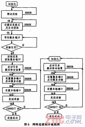 MSP430单片机通过RS-232串口以AT指令形式与SIM300无线模块进行通信。若单片机发送指令正确,则SIM300模块将返回“OK”,错误则返回“ERROR”或者其他格式的指令,单片机通过判断无线模块返回的指令来决定下一步执行的程序,直到成功连接上GPRS网络。网络连接程序流程图如图6所示。
