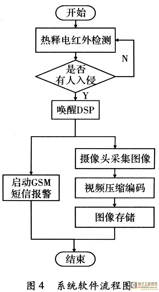 系统软件可分为视频采集及压缩程序、GSM短信报警程序和图像存储程序3部分,软件流程图,如图4所示。