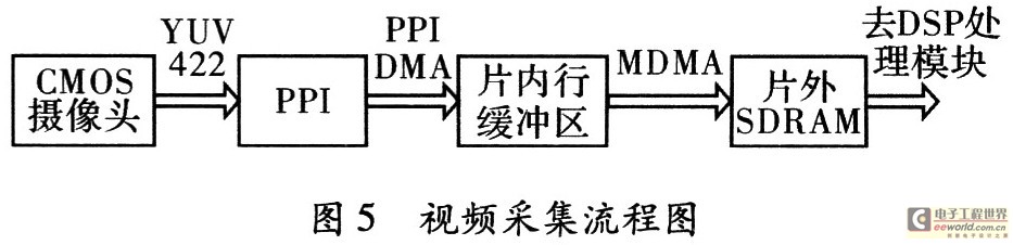 DSP通过I2C接口完成对P03030K图像传感器的初始化,并设置相应的寄存器完成对工作模式、数据输出格式、分辨率、亮度和色度等的设置。P03030K与DSP的PPI口相连,输出图像数据以DMA方式传输到SDRAM中存储,本系统采用乒乓缓冲区的方法传输数据,在内存中开辟两个缓冲区,使用两个头尾相连的描述符链表控制PPI DMA一次传输数据到两个缓冲区中。DMA每采集完一行图像数据之后就产生一次中断,在中断服务程序中使用存储器DMA将数据搬移到片外SDRAM,等待DSP对其进行MPEG-4压缩处理。视频采集流程图,如图5所示。