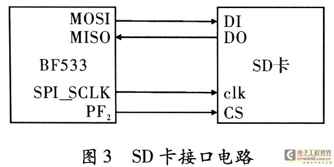 本系统采用SD卡存储压缩编码后的视频数据,SD卡有两种工作模式:SDIO模式和SPI模式。由于BF533支持SPI接口,故采用SPI模式。BF533的SPI接口数据传输速率最快可达到系统时钟的1/4,按系统时钟为118.8 MHz进行计算,SPI的最高数据率可达到29.7 MB/s,考虑到视频流数据量较大,采用双缓冲机制进行存储,能够满足系统要求。SD卡接口电路,如图3所示。