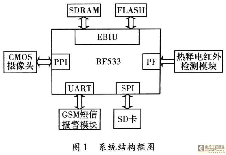 基于BF533的家庭安全系统设计方案,主要由4部分组成,分别为热释电红外检测、CMOS图像采集、GSM报警和图像存储。系统结构框图,如图l所示。热释电红外检测模块与BF533的PF口相连,对室内空间进行检测,一旦检测到非法入侵,立即向DSP发送中断请求,将处于睡眠状态的DSP唤醒工作。GSM短信报警模块与UART接口相连,DSP通过UART口可以控制GSM模块使其发送报警信息。CMOS摄像头连接在PPI接口,PPI口以DMA方式将视频数据搬移到SDRAM中,供DSP进行压缩,存储设备SD卡通过SPI接口与DSP连接,用于保存压缩后的视频码流数据。