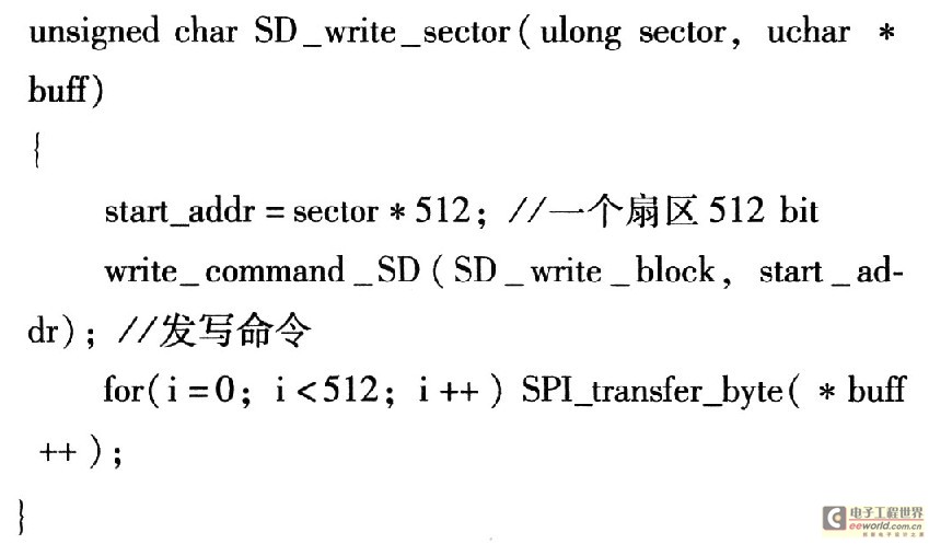 其中,sector为要写的扇区号,buff指向需要保存的数据流,SPI_transfer_byte为通过SPI口向SD卡传输l bit的函数,SD_write_block为SD卡写命令的编码。