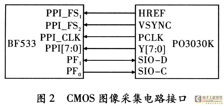 本系统采用Pixelplus公司的P03030K图像传感器完成图像采集功能,P03030K输出30万像素图像,支持多种输出模式和输出数据格式,此处采用QVGA输出模式和YUV4:2:2输出数据格式。P03030K与BF533的PPI口相连接,连接方式,如图2所示,P03030K产生HREF,VSYNC,PCLK这3种同步信号,分别为行同步输出信号、场同步输出信号和输出像素时钟。Y[7:0]为P03030K输出的图像数据信号。BF533使用GPIO的PF0和PF1模拟I2C总线协议,从而实现对P03030K内部寄存器的读写操作。