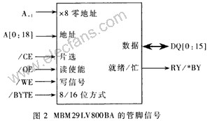 MBM29LV800BA是FUJITSU公司生产的1M×8/512K×l6位的FLASH存储器,其管脚信号如图2所示。/BYTE为×8或×16工作方式配置管脚(/BYTE接低时为×8方式,地址线为[A-1,A0,…A18]共20根,数据线为DQ[0:7],数据线高8位不用;/BYTE接高时为×16方式,地址线为A[0:18]共19根,A-1,不用,数据线为DQ[0:15]);RY/*BY为表示FLASH就绪或忙的管脚(它是集电极开路引脚,多个RY/*BY管脚可通过上拉电阻直接"线与"连接)。