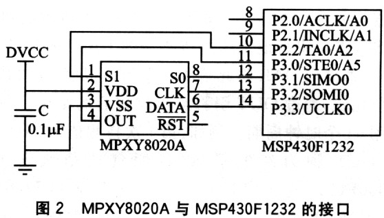 MPXY8020A传感器和MSP430F1232的接口电路如图2所示。其中的串行通信SPI是靠CLK和DATA引脚实现的。传感器在CLK引脚信号的上升沿读取DATA的1位数据,连续8位为1个周期。对于不具备SPI接口的微控制器,可以通过I/O口软件仿真的方式实现通信。本系统中,通过MSP430F1232的I/O口软件仿真SPI,实现采样极限值的设置。