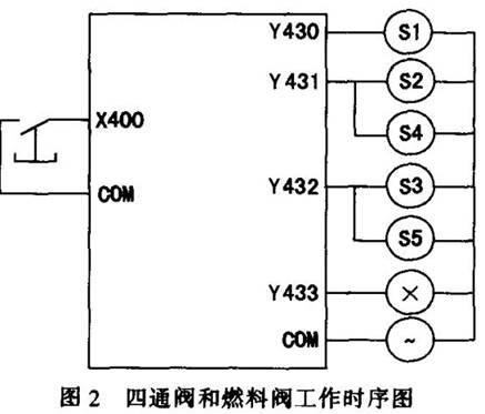 当起动开关合上时,X400接点接通,Y430线圈得电,电磁阀S1打开,四通阀切换至1-1位置;Y431线圈得电,电磁阀S2,S4打开,高温空气发生器A侧点火燃烧。与此同时,Y431常开触点闭合,T552开始计时,28s后T552常闭触点打开,Y431线圈失电,电磁阀S2,S4关闭,A 侧停止燃烧。30s后,T551的常闭触点打开,T550常闭触点打开,线圈Y430失电,电磁阀S1关闭,四通阀切换至2-2位置;Y430常开触点闭合,Y432线圈接通,电磁阀S3,S5打开,B侧点火燃烧;同时Y432常开触点闭合,巧52开始计时,28s后T552常闭触点打开,Y432线圈失电,电磁阀S3,S5关闭,B侧停止燃烧。30s后完成一个循环过程,并周而复始地重复上述过程。其控制命令程序如表1所示。