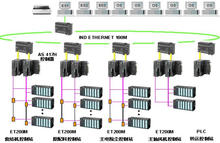 ----烧结PCS7控制系统,控制器选用3套AS-417-2H和1套AS-414-2H冗余控制站" title="控制站">控制站;现场控制分站采用冗余的ET200M分站,并具备热插拔能力" title="热插拔能力">热插拔能力;HMI由3套ES工程师站和6套OS操作员站组成;控制器与HMI采用光纤环网" title="光纤环网">光纤环网互连,控制分站ET200M与主控制器通过冗余的 PROFIBUS DP工业现场总线相连;软件采用PCS7 V6.0。