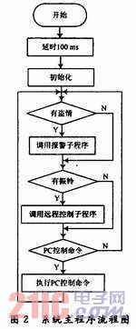 系统上电后,首先延时100 ms,让单片机和外围电路有充分的时间复位。在系统初始化过程中,使能C8051F020的外部中断6,7和串口中断,并将各个中断请求标志位复位。外部中断6处理远程控制,外部中断7处理报警,串口中断处理.PC控制命令。循环扫描各路中断标志位,如果中断请求标志位置位,则转入相应的中断服务程序。如图2所示。