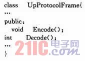 该类对应上行协议的帧,其中提供成员方法Encode()和Decode()来实现对上行协议的封装和解析。在程序中只需创建一个帧的对象就可以通过这些函数实现封装和解析的功能。下行协议采用同样的方法处理: