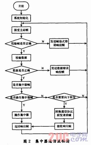 图2描述了集中器通信流程,通信的工作始终运行在外围的无限循环中判断和接收主站请求帧,当接收到主站命令后先判断此数据帧是否校验正确,若错误检查错误原因,并根据错误类型设置错误代码,然后发送异常应答帧;否则判断是否是集中器命令,若不是集中器命令则需要判断是否需要转发,需要转发则首先将协议进行转换,然后将命令转发出去,接收到转发响应后再向主站响应;若是集中器命令,则根据操作码对集中器进行相关操作,操作完成后返回响应帧,然后进入下一个循环继续等待主站的命令帧。