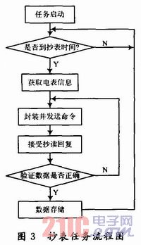 定时抄表是集中器的重要功能,通常有抄表日抄表,抄表月抄表,整点抄表;零点抄表等多种类型。集中器首先启动抄表任务功能,然后不断检测当前时间是否符合设定的抄表时间,如果不符合则继续下一轮的检查;否则获取到要抄读的电表信息,然后向电表发送抄读命令帧,收到回复后先验证数据的正确性,如果数据正确则进行相关的入库等操作,否则重发抄读命令(一般设为3次),当数据处理完成后,进行下一轮循环。整个流程如图3所示