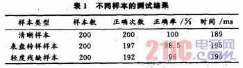 从表1可以看出,在二值化较好,数字清晰的情况下,识别率达到了100%,对有轻微点状噪声和轻微断痕的样本,识别率也很高,但对存在数字残缺的样本,识别率有所下降。就识别时间而言,整屏数字(6或5个数字)的识跗时间小于200 ms,明显低于仪表数字的最快变化时间1 000 ms。
