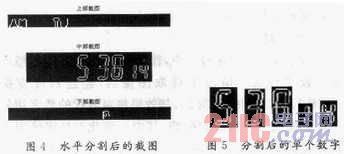 经过水平投影将图像分割成上、中、下3部分。对中部数字区域的二值图像从上到下逐行扫描;获取到图像的水平投影图。利用行间间隔形成的水平投影间隙,即可将各数字行分割开来,如图4所示,然后提取中部截图,再对中部数字区域做垂直投影,如图5所示,计算峰谷可以将单个数字分割出来。字切割是从行切分后,得到的图像中将每一个数字分割出来,利用每行字符的垂直投影中字符之间的间隙即可将各个数字分割出来。