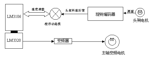 机床主轴是由一台5.5KW的电机驱动,转速的变化由5.5KW变频器调节,变频器的控制信号来源于模拟量输出模块LM3320的第一通道。由于在电熔放电加工过程中,主轴放电盘与工件头架是处于非接触状态,且两者间需保持一定的相对运动(线)速度才能保证正常加工,因此,主轴转速随工件头架转速的变化由 PLC系统作相应调整。PLC是根据旋转编码器测量反馈的当前工件头架速度信号适时调整变频器的输出驱动频率值,从面保证机床主轴变频电机能以要求的速度平稳运行。