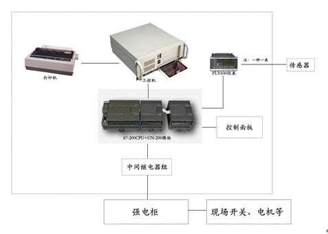 整个系统的I/O点约为120个左右,DI和DO点基本相当,为了解决上述问题,我们采用西门子S7-200PLC的214型号CPU模块,其余的I /O模块和用于含水率检测的AI模块采用亿维的UN200系列,配料计量采用山东博硕自己研发的配料控制仪表PLY600实现。UN200模块中,还使用了8DI/8DO的数字量模块作为键盘扫描模块,以采集手动操作的信号,系统构成如下图所示: