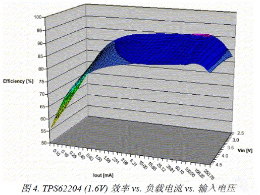 应用中,在负载瞬变及P-MOSFET开启的时间差期间,输出电容必须满足负载的所有电流需求。由输出电容支持的输出电流将引起跨越等效串联电阻两端的电压降,从而使输出电压降低。而等效串联电阻越低,当输出电容供给负载电流时的所产生的电压损失也就越小。为了最小化解决方案尺寸,并改善TPS62200转换器的负载瞬变行为,推荐采用4.7μH电感及22μF输出电感工作。