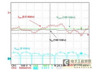 图4及图5显示出在高线路时会面对的一个问题。VAUX电压在退磁相位期间较小,而这时Vin较高,因为VAUX与输出输入电压差成正比VAUX=N(VOUT-VIN)。此外,如图4所示,输入电压在开关频率呈现出交流含量。因此,VAUX波形并不平坦,相反,它还包含纹波。在低线路时,这纹波可以忽略不计。在高线路时,VAUX幅度在退磁相位期间较小。因此,这些振荡可能大到足以导致过早检测电感磁芯复位。事实上,如图4和图5所示的那样,零电流检测的精度降低了。