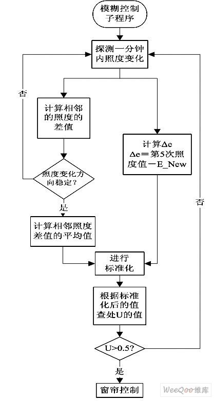 系统首先对关键点照度进行监控,当照度发生变化时,通过模糊判断该变化是干扰量还是需要调节的变量。首先以一分钟为时间节点,主控单元通过传感器获得五次采样的照度值。通过依次计算相邻两个数据之间的差值,判断照度的大小变化。差值为正表示照度变大,差值为负表示照度变小。仅当五次的变化同为正或同为负时,也即一分钟内照度的变化趋势一致时,用第五次采样的值与第一次采样的照度值之差作为CE 的值。用五次差值的平均值作为模糊规则中的ΔE。根据前面规定的模糊控制规则,程序可以通过调用相应的窗帘调节子程序完成相应的调节动作。
