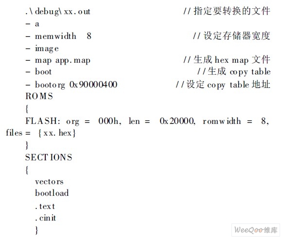 一种方便的生成引导表的方法是, 当工程文件编译生成. out 文件后, 用CCS 自带的hex6x 可执行程序将其转化为用于程序引导的. hex 文件。这种方法需要编写一个转换命令文件作为hex6x 命令的输入参数,具体如下: