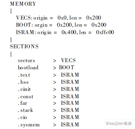 cmd 文件的作用是实现前两节所述的二次装载代码、中断向量表等的存储空间分配, 其主要包含内存的划分以及各程序代码段的load 地址和run 地址的分配。常见的cmd 文件如下所示: