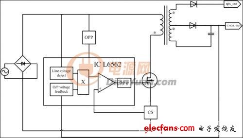 为降低成本将L6562应用于flyback topology实现单级PFC" title="PFC">PFC,原理框图如上图所示,其工作原理与boost 类似,将副边输出电压反馈结果与检测到的原边输入电压相乘,以此确定原边电流峰值。由此得到的原边输入电流是以100Hz正弦为包络的高频的、三角形电流,经滤波后输入电流为与输入电压同相位的正弦波形电流。原、副边电流如fig.8所示。由图可知以下两点: