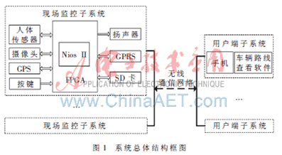 远程监控报警系统分为现场监控子系统和用户端子系统两部分,系统总体结构框图如图1所示。本系统可工作在室内或车内,两种情况下都有智能监控、智能报警和手动报警模式。用在室内时,系统通过人体传感器和摄像头采集现场信息;用在车内时,通过GPS模块接收车辆地理位置信息,通过摄像头采集现场图像。采集到的现场信息送入FPGA中的嵌入式软核Nios II做智能检测。系统通过GPRS模块接收用户的控制命令,同时以短信和彩信的方式向用户发送现场信息。用户端子系统的车辆跟踪软件可实现车辆报警信息拦截和路线显示,便于用户查看。