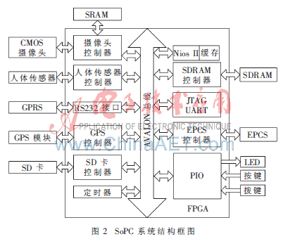 系统的主控制芯片是一片FPGA,结合SoPC技术,在FPGA中加入了嵌入式软核Nios II,通过Avalon总线与外围设备建立联系。系统硬件结构框图如图2所示。