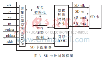 SD卡控制器框图如图3所示。AVALON总线接口模块是Nios II处理器和SD卡控制器模块进行数据交互的桥梁。复位初始化模块要保证片选信号在上电后的74个时钟周期内为高,完成复位。此后通过命令读写控制模块发送CMD0命令给SD卡使其进入SPI模式。命令读写控制模块按照SD卡命令时序完成SD卡命令号、参数、命令校验的发送和命令回执的读取,如果是读写操作还要对数据进行发送和接收,双口RAM用作读写数据缓存。数据转换和时钟产生模块完成SD卡和Avalon总线间信号的时序转换。