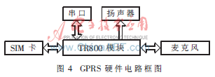 本系统采用iWOW公司的GPRS模块TR800实现无线通信。TR800硬件电路设计框图如图4所示。SIM卡是每个现场监控子系统的ID,扬声器用于用户向现场喊话,麦克风用于捕获现场声音,方便用户监听。TR800通过串口芯片RS232与FPGA通信。