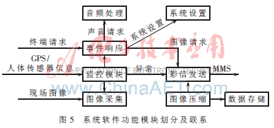 现场监控子系统的软件功能模块及其联系如图5所示。系统只响应有权限用户的访问,用户权限数据存储在SD卡的隐藏扇区,即使格式化也不丢失。用户可通过短信对系统实现用户管理,包括设置管理员、添加或删除用户、密码设置等。