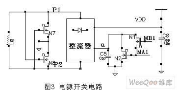 电源开关电路由储能电容,NMOS管构成的整流器及开关电路组成,如图3。P1,P2直接连到线圈L0的两端,通过电磁耦合在P1,P2上感应出交流电,经整流后在储能电容C0端产生直流电压VDD。调压电容C5在N2管导通后构成放电回路使P1,P2上的电流开始对C5充电而停止对C0充电,使C0两端电压保持稳定,即为负载电路提供稳定的电源电压。
