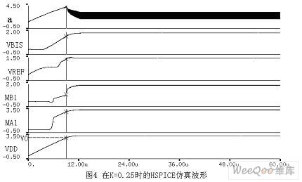 在射频卡正常工作环境中,卡和阅读器的耦合系数很小一般为0.1"0.35左右,阅读器信号电压一般为12V。仿真验证中,加12V、13.56MHz的测试激励以在电感L0上得到感应电流。采用0.35um的SPICE模型,耦合系数设为0.25,得到VDD稳定电压为3.35V,Hspice仿真结果见图4: