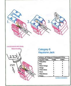 在六类布线系统施工中除了布放线缆外,打线也尤为重要(包括信息模块和配线架等),在模块上打线看似简单,却大有学问。要想打好打快,首先就要了解六类非屏蔽线缆的结构和生产工艺。六类线缆中采用4线对隔离装置,这种线缆内部带螺旋式十字支撑结构,将所有双绞线锁定在四个相对固定的位置,可有效降低在全频工作范围(0-250MHz)线对之间的相互干扰,具有稳定的平衡特性,实际施工环境下,能表现出良好的抗拉、抗挤压特性,采用23AWG规格的十字骨架六类线缆在安装后会具有较高的、稳定的串扰衰减和阻抗等电气性能。在GB5023-2007《综合布线工程验收规范》的6.0.2 中就规定了“对绞电缆终接应符合下列要求: