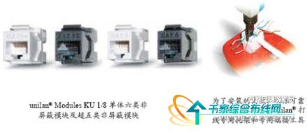 德特威勒公司的六类非屏蔽布线系统使用的模块为unilan®KU1/8模块-Cat.6RJ-45接口,RJ是Registered Jack的缩写,意思是“注册的插座”。在FCC(美国联邦通信委员会标准和规章)中的定义是,RJ是描述公用电信网络的接口,常用的有RJ-11和RJ -45,计算机网络的RJ-45是标准8位模块化接口的俗称。RJ-45模块的核心是模块化插孔。连接片采用镀金铜铍合金;IDC采用铜磷合金。镀金的连接片或插座孔可维持与模块化插头弹片间稳定而可靠的电连接。由于弹片与插孔间的磨擦作用,电接触随插头的插入而得到进一步加强。插孔主体设计采用了整体锁定机制,这样当模块化插头(如RJ-45插头)插入时,插头和插孔的界面处可产生最大的拉拔强度。RJ-45模块上的接线块通过线槽来连接双绞线,锁定弹片可以在面板等信息出口装置上固定RJ-45模块。常见的非屏蔽模块高2cm、宽1.6cm,厚3.5cm,模块体采用抗高压阻燃材料、UL94V-0等级。Snap-in简便卡接方式。特殊的工艺设计提供至少800重复插拔,模块上标有T568A/568B打线色标,避免不必要的打线误操作。这类模块通常需要打线工具——unilan®专用单对端接工具。
