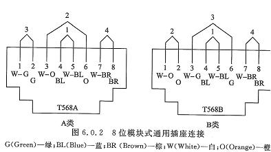 2 对绞线与8 位模块式通用插座相连时,必须按色标和线对顺序进行卡接。插座类型、色标和编号应符合图6.0.2 的规定。