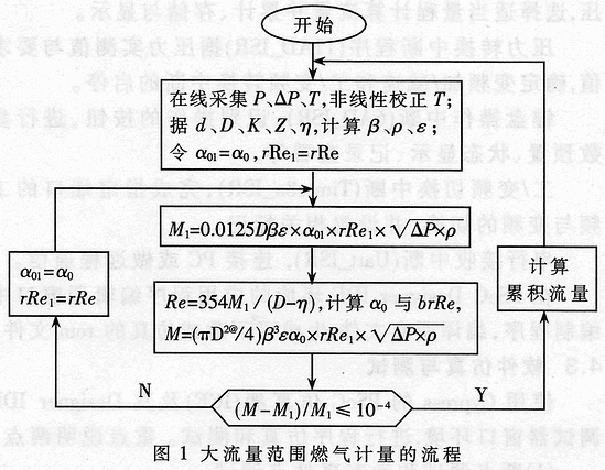 孔板式差压流量计在不变节流件开孔直径下扩展量程比,主要是采用增设差压量程切换单元的方法:在流量小、差压低时,使用小差压量程检测计算;反之,使用大差压量程检测计算。检测计量流程如图1所示。图1中参数T、P、△P、d、D、K、Z、η、β、ρ、ε、α0、rRe、M分别表示温度、压力、差压、孔板开口直径、计量管段直径、介质等熵指数、气体压缩系数、介质粘度、d/D、密度、流速系数、流出系数、管道雷诺数、流量。